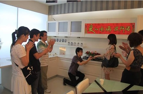 請你嫁給我吧,以后我會像灰太狼一樣順從,打不還口,罵不還手;像上海男人一樣愛做家務,任勞任怨,關懷體貼,像變形金剛一樣呵護,知難而上,絕不退縮…….第二屆丈夫節活動現場,一位年青小伙在和女友在買櫥柜過程中,當場向女孩求婚,并奉上求婚鉆戒和丈夫專用灰太狼櫥柜,使得女友喜極而泣,當場答應。