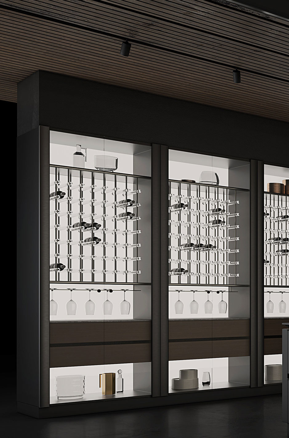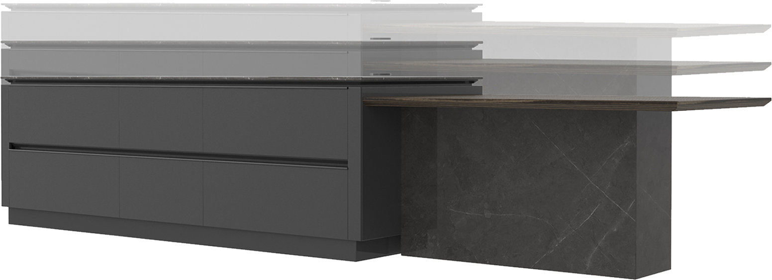 設計師大膽運用碰撞的手法 烏斑木原生肌理,質感自然兼具時尚。啞光金屬烤漆,格調輕奢沉穩(wěn) 兩種不同材質的碰撞,自然感和力量感十足。廚房智慧體驗系統(tǒng)融入整體設計,科技與藝術美學的碰撞融合。