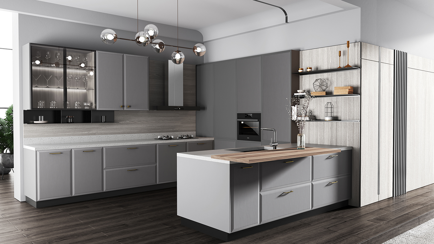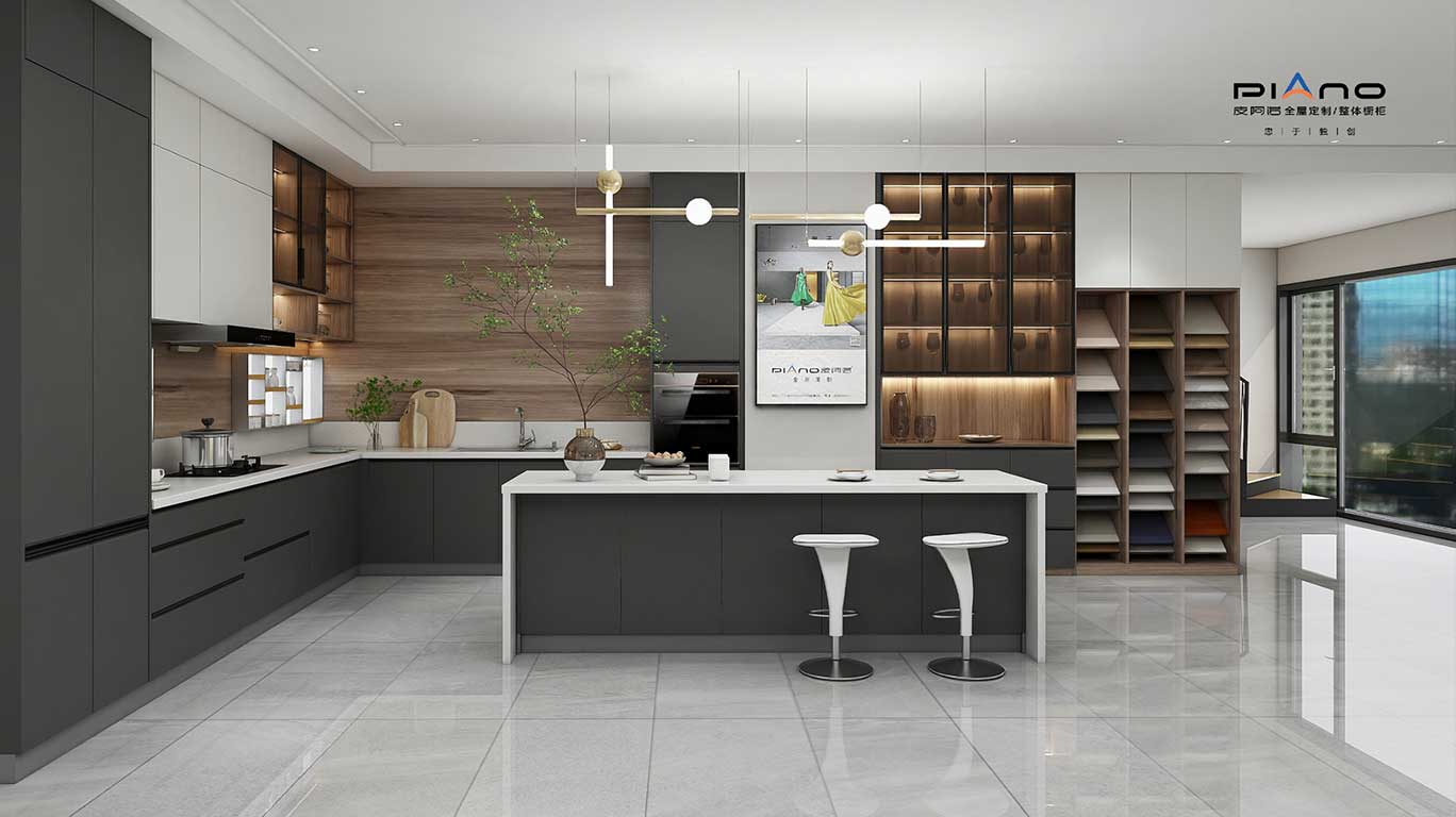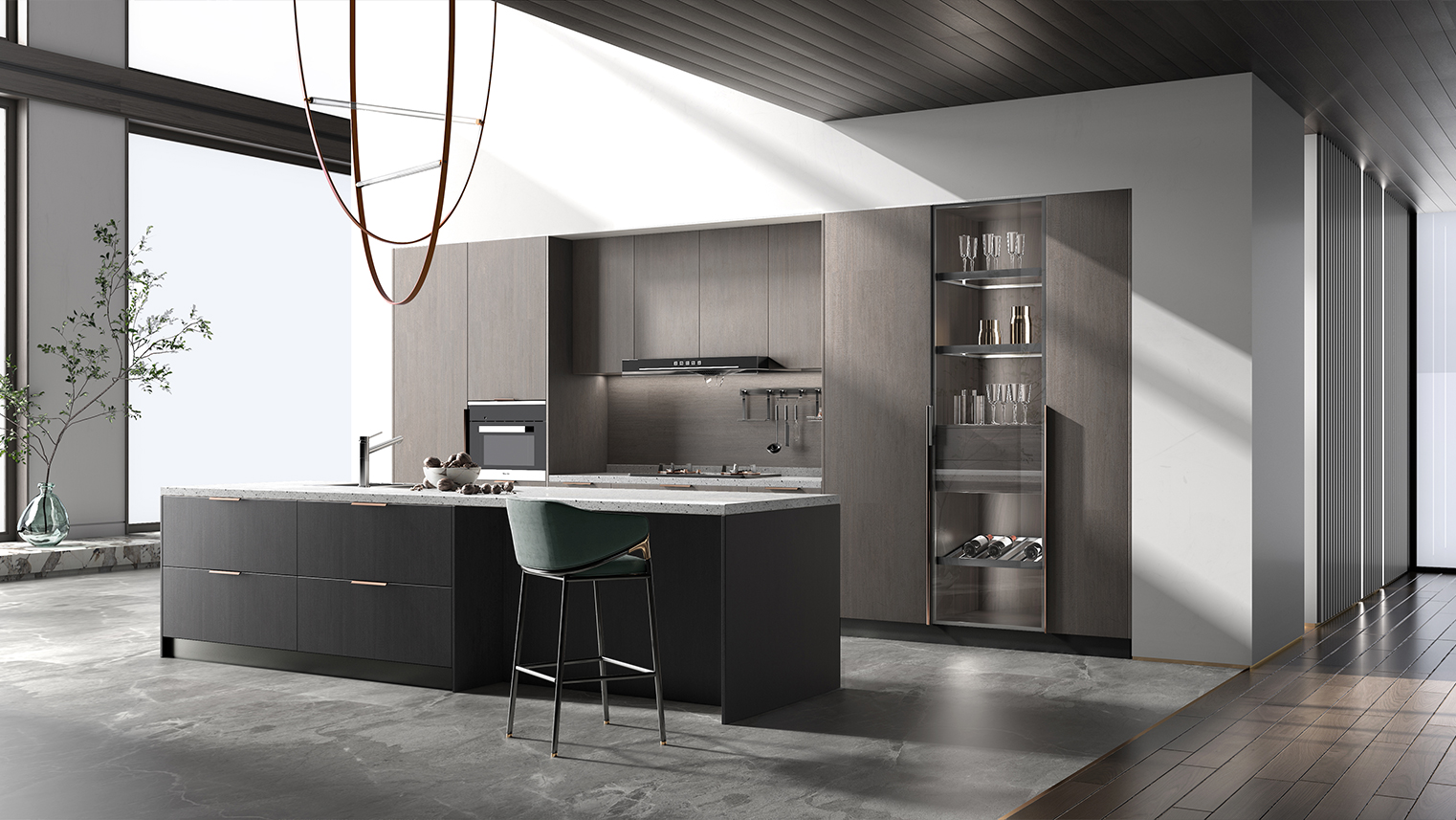 摒棄復(fù)雜的裝飾,著重空前的氛圍,在簡潔大氣的設(shè)計(jì)中增添了一份細(xì)膩與精致。高級(jí)自然的門板肌理搭配玻璃柜、開放柜設(shè)計(jì)。現(xiàn)代輕奢的視覺美感帶入眼前,使其更富時(shí)代故事感。