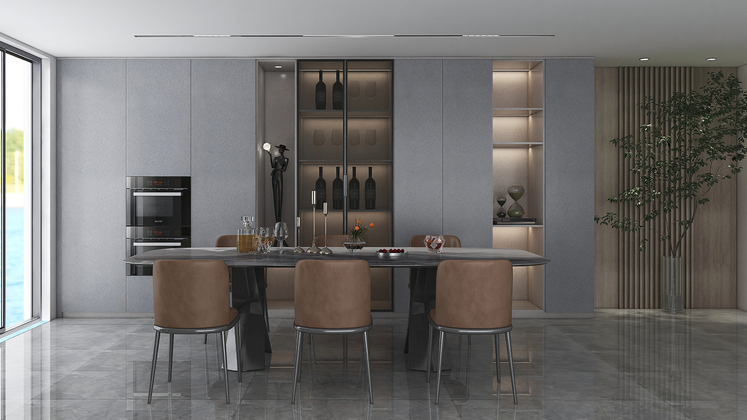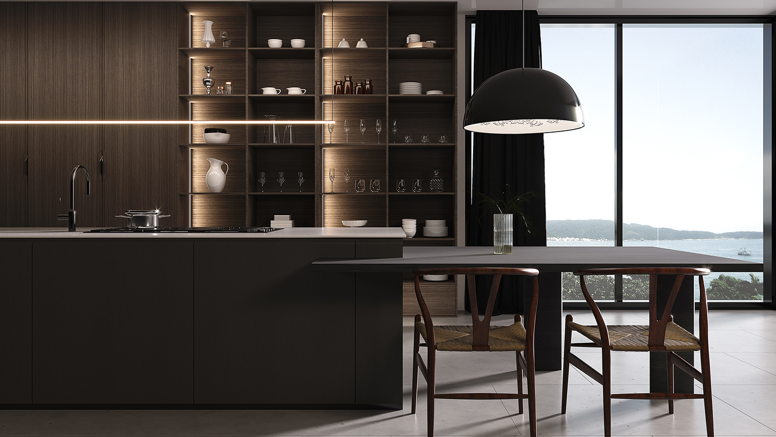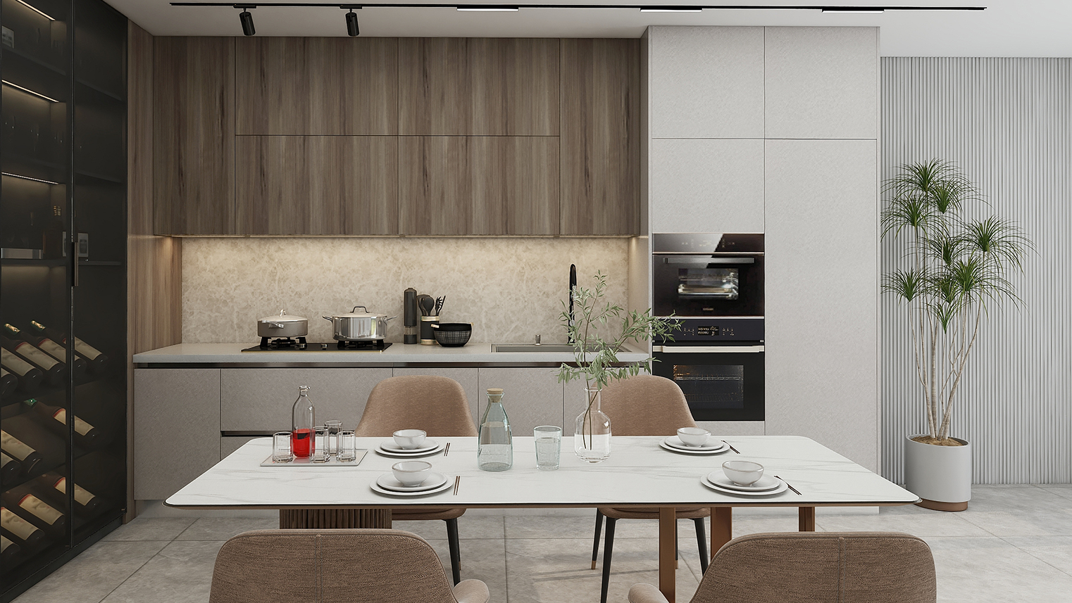 摒棄復(fù)雜的裝飾,著重空前的氛圍,在簡潔大氣的設(shè)計(jì)中增添了一份細(xì)膩與精致。高級(jí)自然的門板肌理搭配玻璃柜、開放柜設(shè)計(jì)。現(xiàn)代輕奢的視覺美感帶入眼前,使其更富時(shí)代故事感。