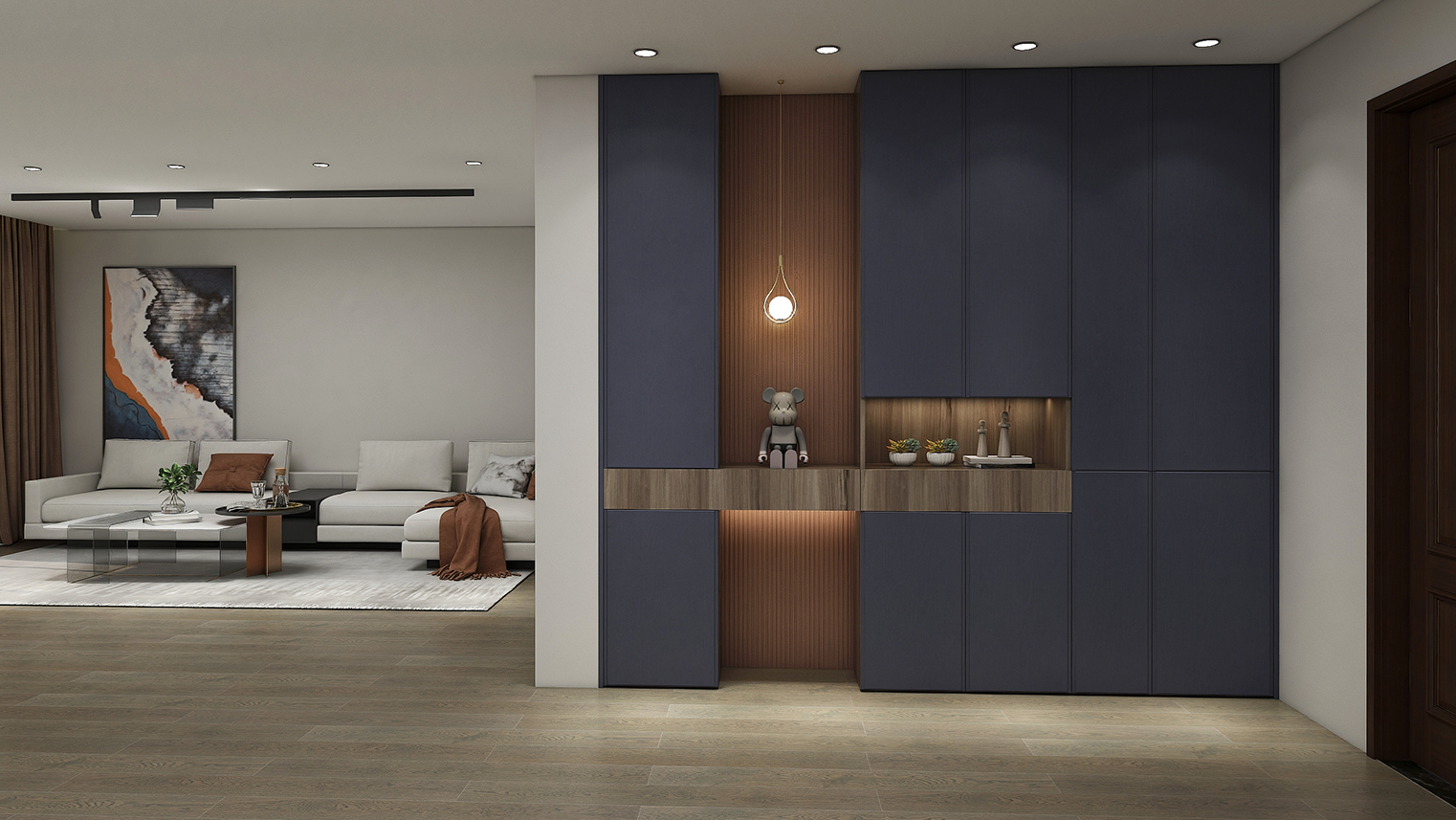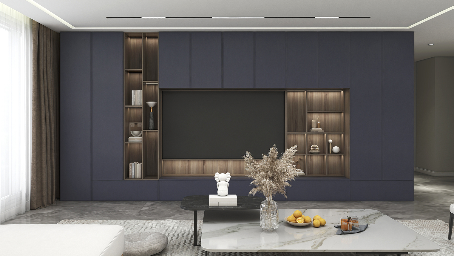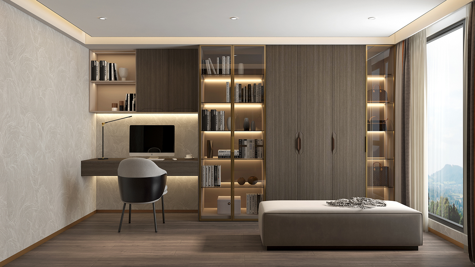 摒棄復(fù)雜的裝飾,著重空前的氛圍,在簡潔大氣的設(shè)計(jì)中增添了一份細(xì)膩與精致。高級(jí)自然的門板肌理搭配玻璃柜、開放柜設(shè)計(jì)?,F(xiàn)代輕奢的視覺美感帶入眼前,使其更富時(shí)代故事感。