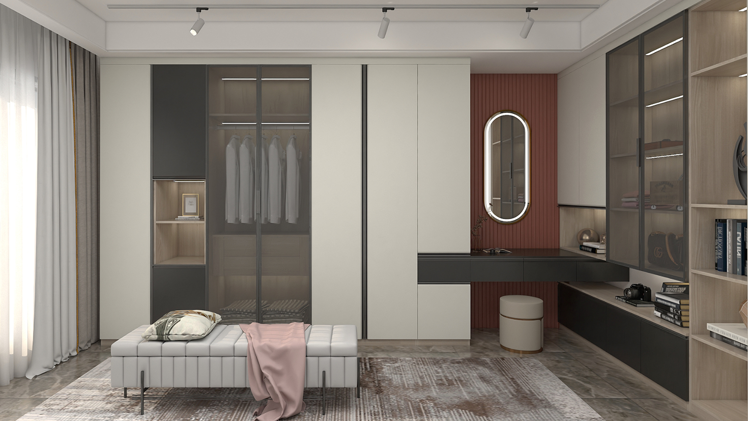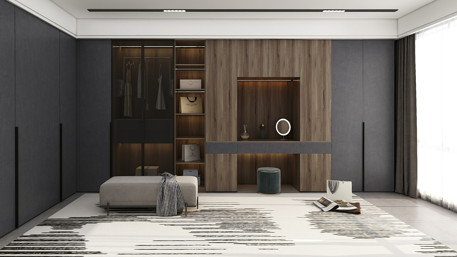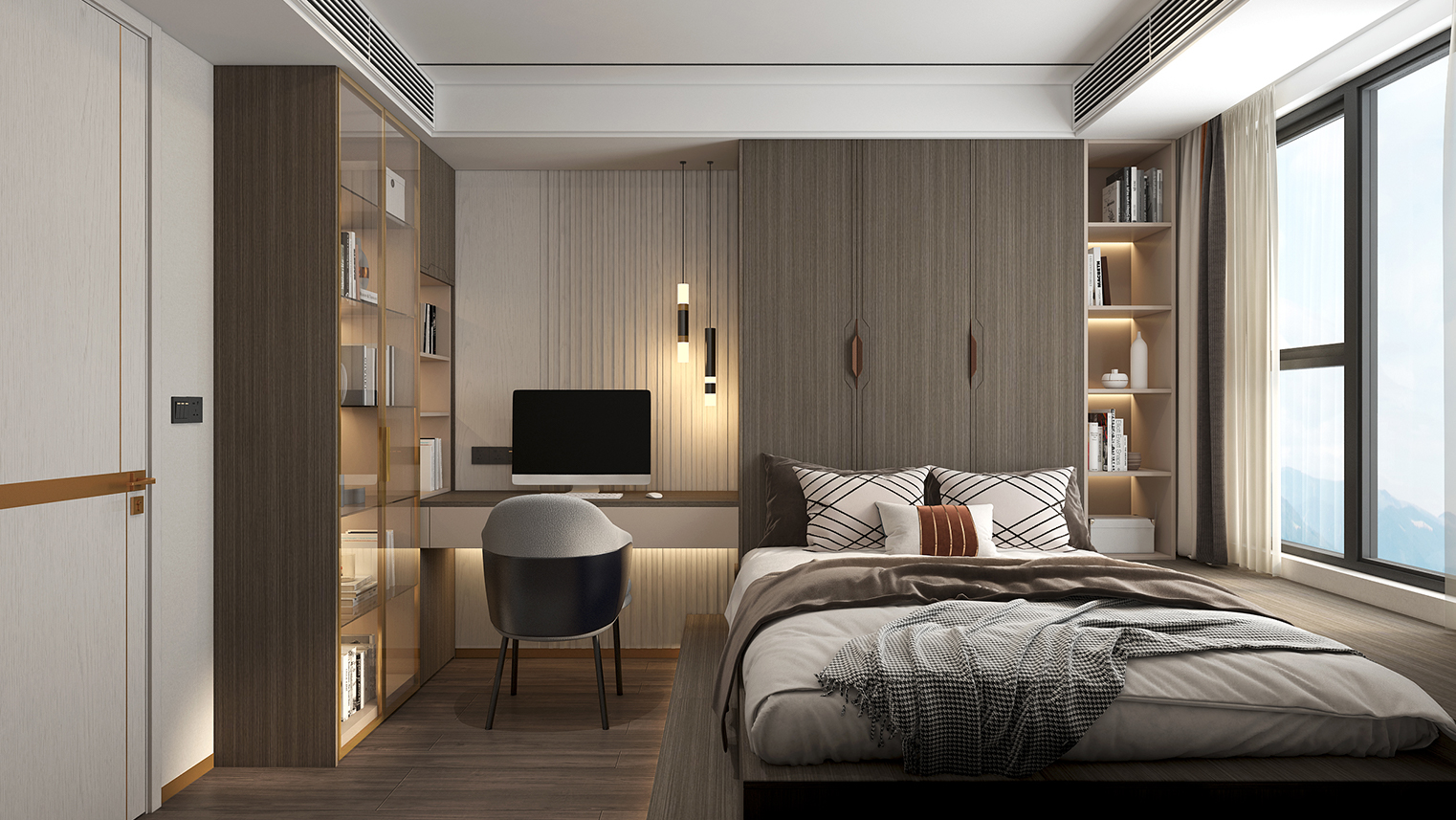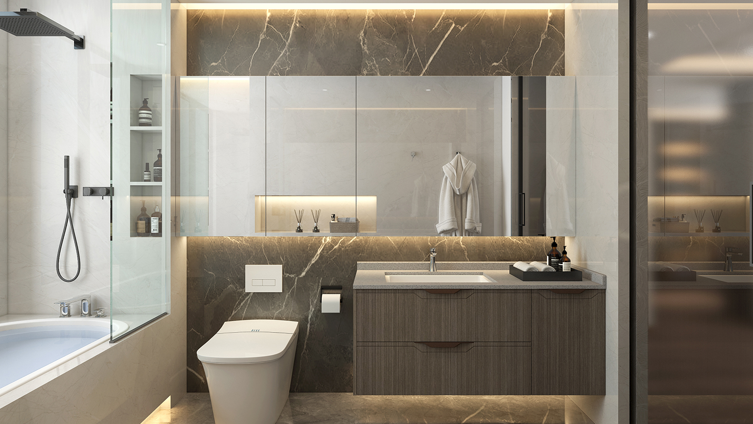 摒棄復(fù)雜的裝飾,著重空前的氛圍,在簡潔大氣的設(shè)計(jì)中增添了一份細(xì)膩與精致。高級(jí)自然的門板肌理搭配玻璃柜、開放柜設(shè)計(jì)?,F(xiàn)代輕奢的視覺美感帶入眼前,使其更富時(shí)代故事感。